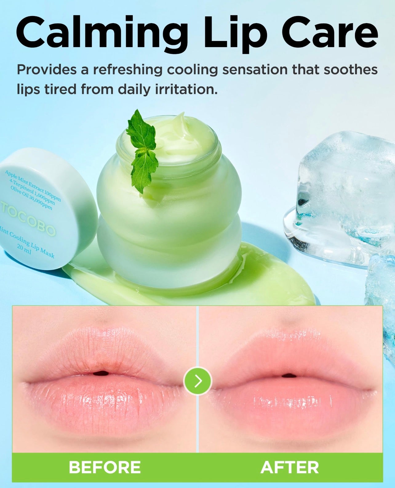 - Cuidado labial calmante e hidratante durante todo el día para labios estresados por la irritación.